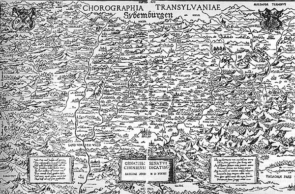 Honterus 1532. évi Erdély térképe. Mérete 55X37 cm. Fametszet 1:500000-es méretarányban.