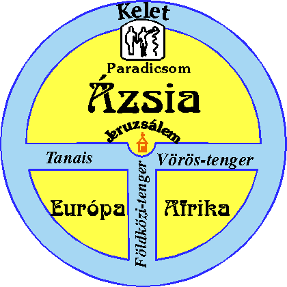 Tanais folyó és a Fekete-tenger, a jobb oldalit, a Nílus képezi. A T függőleges szára a Földközi-tenger. A térkép keletre tájolt. A fölső félkör Ázsia, a bal oldali