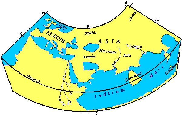 Alul Ptolemaiosz világtérképének vázlata látható az 1490-es római kiadás alapján. Vissza a címlapra!