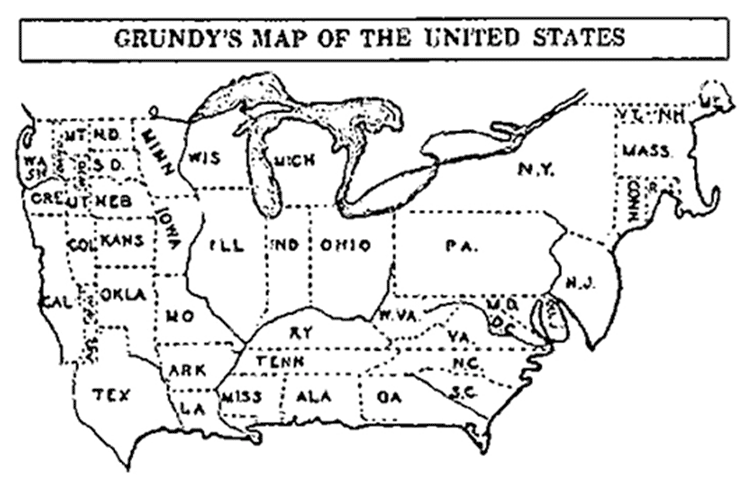 Joseph Ridgway Grundy amerikai textilgyáros volt, aki a Republikánus Párt tagjaként képviselte Pennsylvaniát az Egyesült Államok Szenátusában (1929-1930). Ebben az időszakban készült a szóban forgó torzított kartogram-térkép, amely az adózásról szóló kongresszusi javaslatának a részeként vagy mellékleteként jelent meg a Washington Post napilapban 1929. november 3-án.